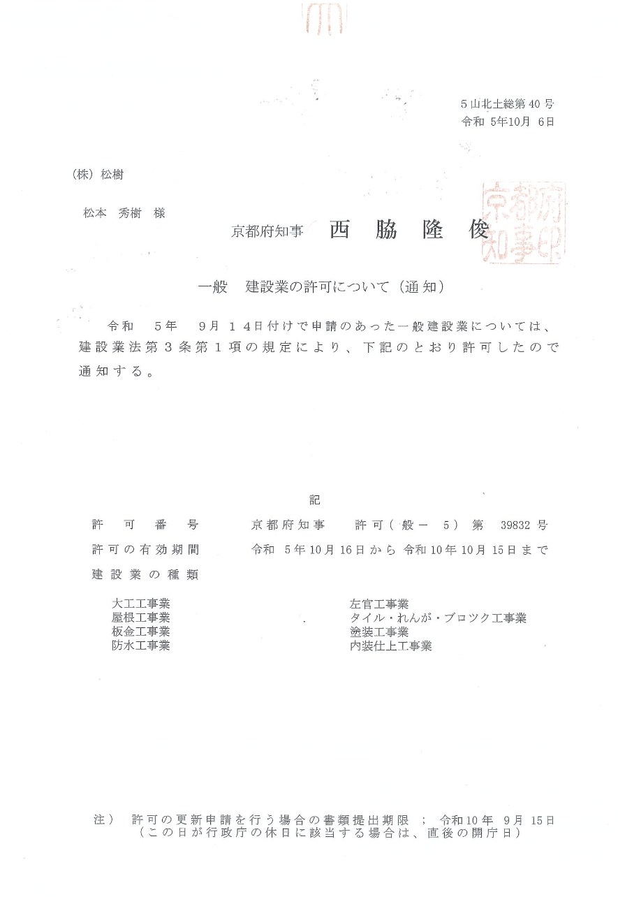 | 認可番号 | 京都府知事許可(般-5)第 39832 号 |